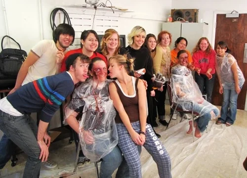 Group SPFX Makeup exercise day. Students worked together to adhere blood bladder systems up to an exit would that they jointly designed and executed.
