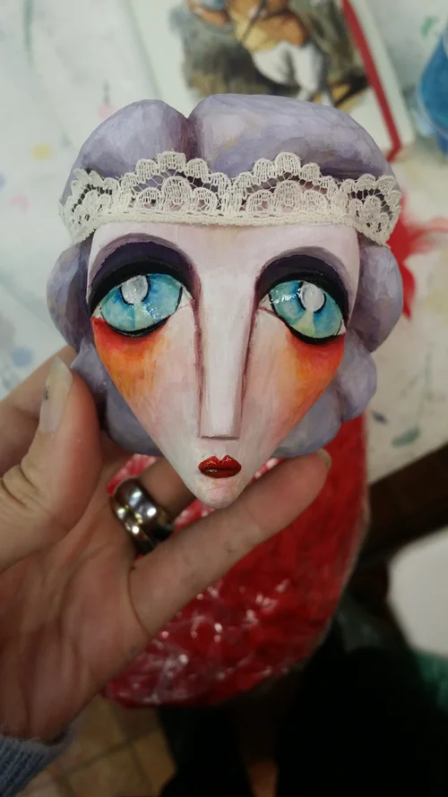 A process shot of Frances, my wooden stop-motion animation puppet that I made at the Puppets in Prague Stop-Motion Animation workshop. Here, I'm trying to figure out if I needed to have a lace tiara sort of thing around her head, but ultimately, I opted to keep her head bare.