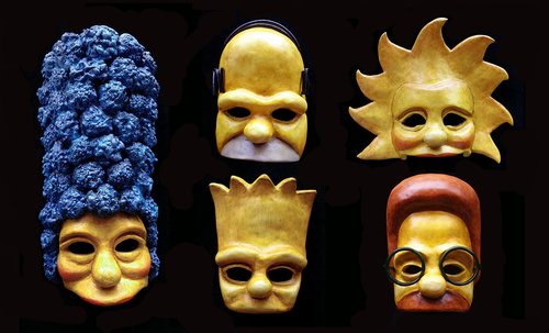 These are the masks, (clockwise, L to R) Marge, Homer, Lisa, Flanders, and Bart, that I designed for Mr. Burns, a Post-Electric Play.