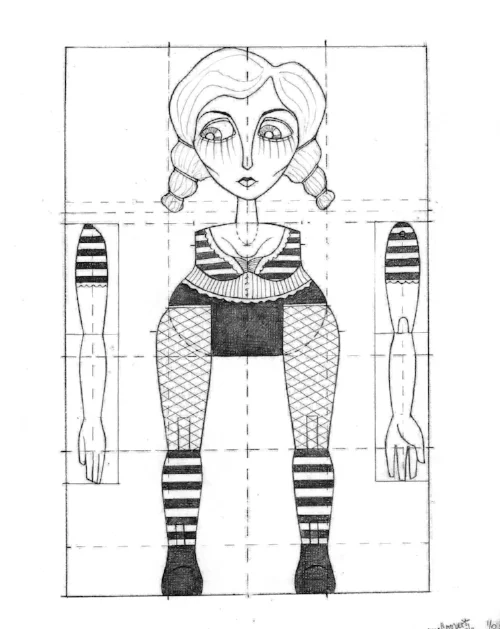 This is Delilah, the Strong Woman's technical rendering. She was the very first marionette that I built, as well as the largest. she stands a little over a foot tall. She is made of wood and leather and fully manipulatable. She performed in the 2011 Prague Quadrennial Festival in a street production.